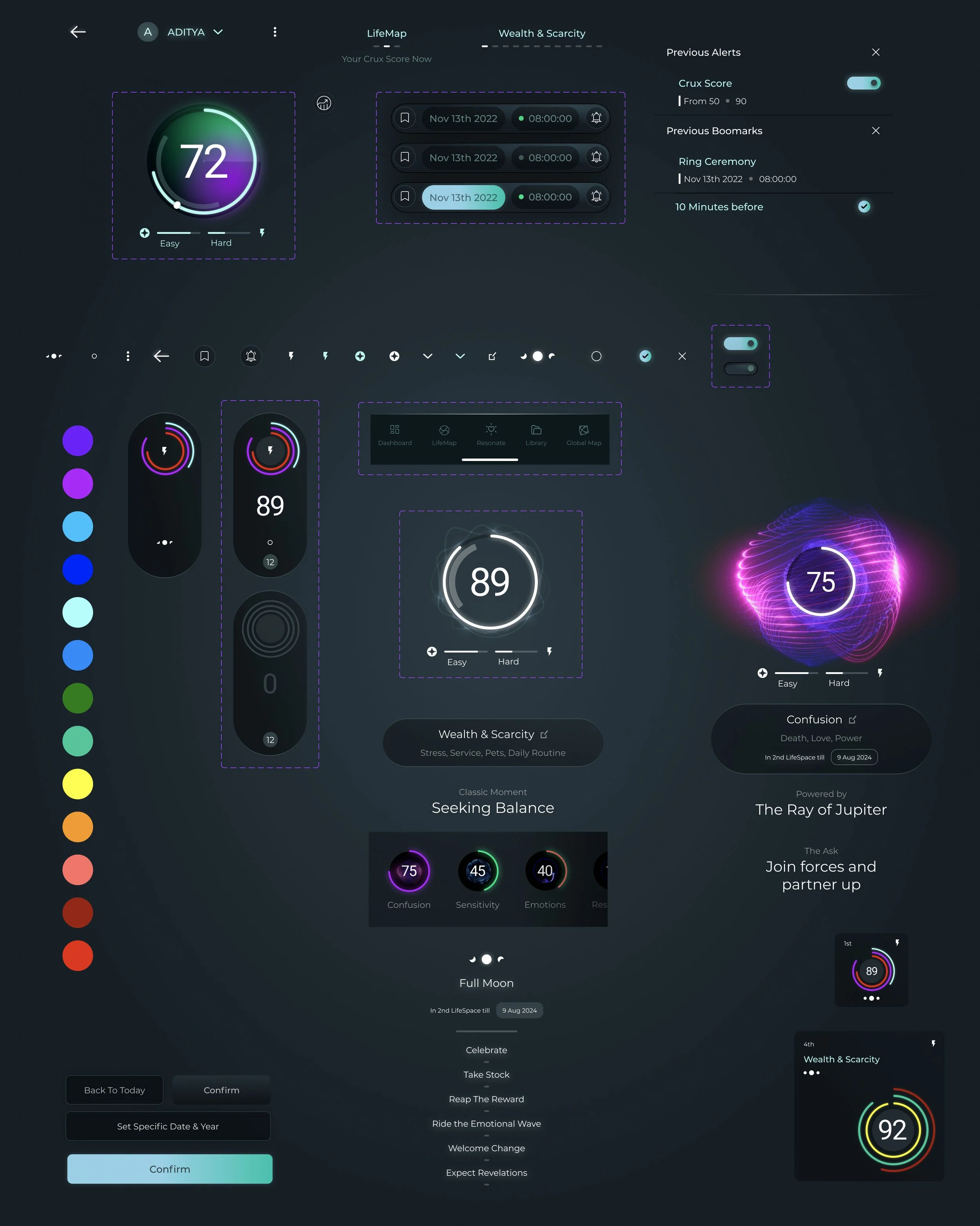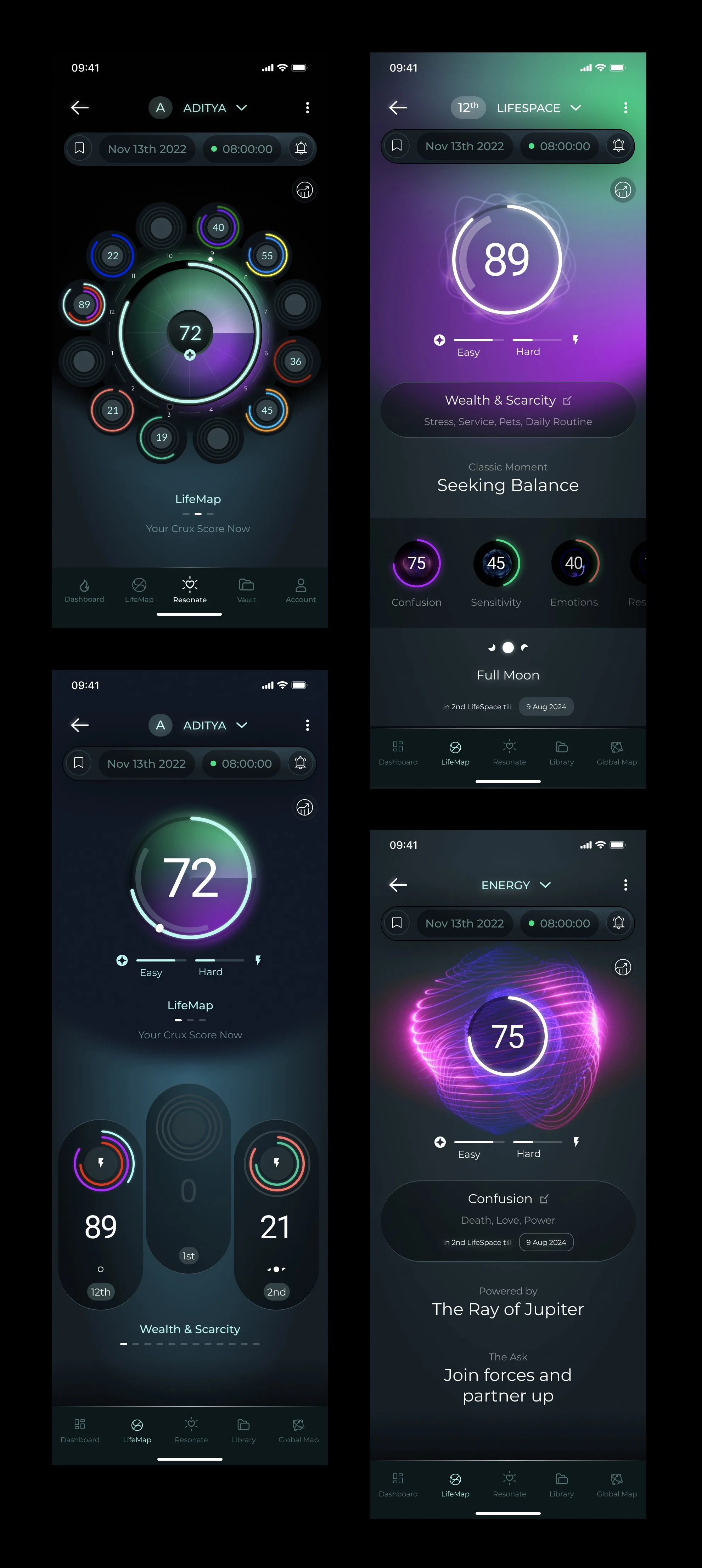 We created a visual approach to our product led by the symbolism of light over darkness. Not only does this create a dramatic backdrop for our product, but it anchors it in the colours, tones and textures we see in space. Based on our visual platform, we developed a name and visual brand ID. This, in turn, influenced our approach to UI design which all works to capture and reflect aspects of energy and light. As a visual payoff, we also created artistically interpreted animations for all the 12 planets (energies). In terms of features, to enrich the experience, users can bookmark moments, save multiple LifeMaps, create RelationshipMaps, monitor energy stats over time, share maps, and set alerts for upcoming energy spikes. The finalized design solution is currently in development, scheduled for launch in Fall 2024.